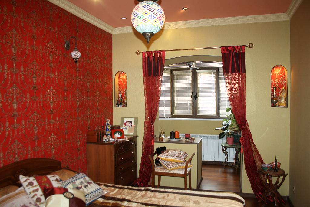 - Для создания восточной атмосферы используются люстры, имитирующие китайские фонарики, конструкции из этнических натуральных материалов и дорогих тканей. Допустимо наличие традиционных восточных узоров – сакуры и других растений, драконов и пейзажей.