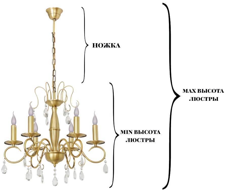 - Макс. высота светильника/люстры — это расстояние от точки крепления на потолке до низа конструкции, т.е. с ножкой, цепью и т.д.;