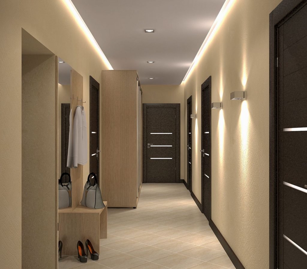 Частой проблемой типовых квартир является длинный узкий коридор, который представляет собой неудобное проходное помещение. Перед дизайнерами стоит задача сделать комнату эстетически привлекательной и удобной. Кроме правильного подбора мебели и цветового решения важную роль играет освещение прихожей. Здесь оформители идут разными путями.
