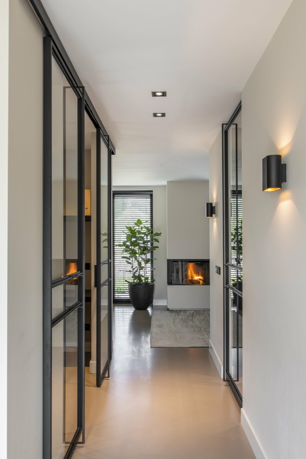 Переход в остальные помещения должен максимально сглаживать разницу в освещенности коридора и жилых комнат. Резкая смена интенсивности света вызывает дезориентацию и дискомфорт. Переходная зона может быть оборудована светильниками или получать световые лучи, проникающие из дверей комнат. Для последнего случая межкомнатные двери должны включать в свою конструкцию пропускающие свет стеклянные вставки.