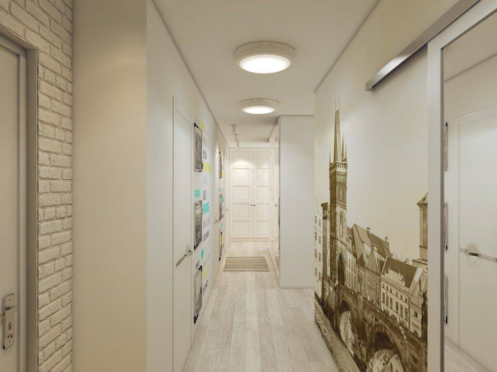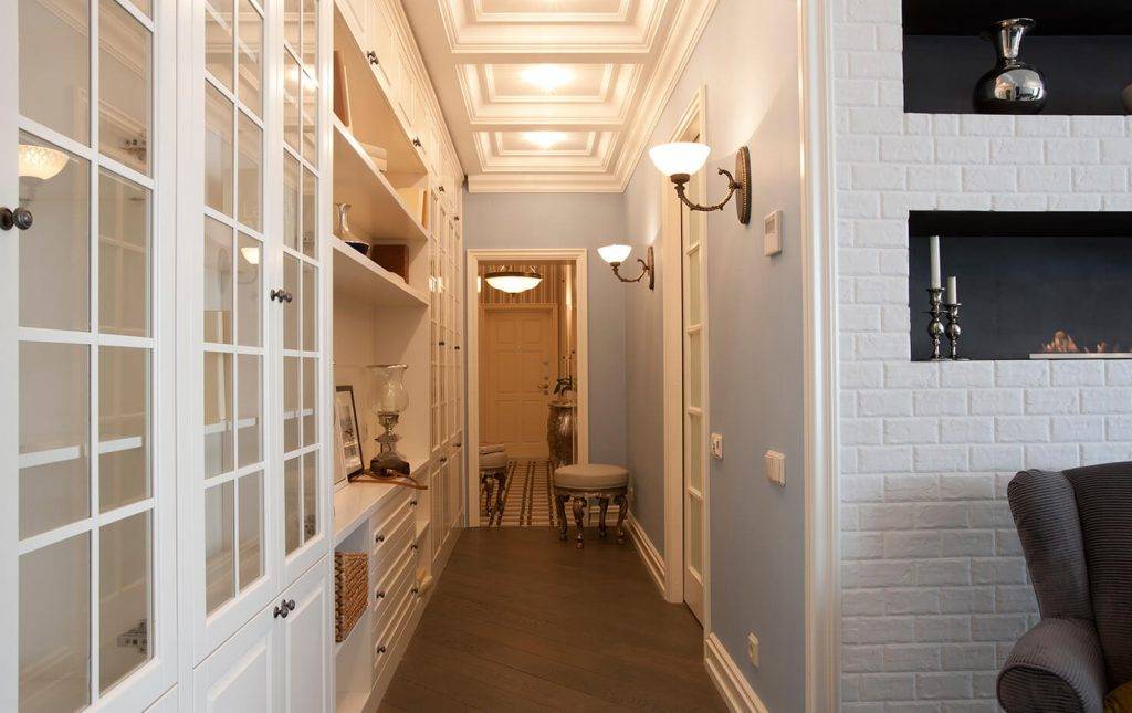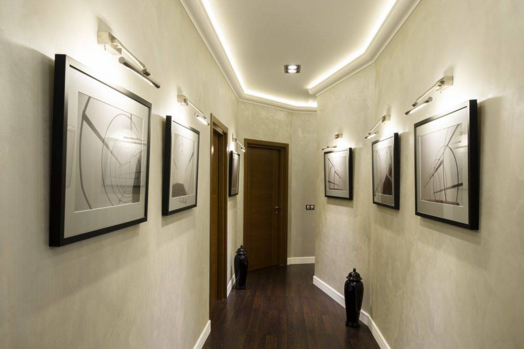 - В случае с узким коридором исправить ситуацию поможет светильник, ширина которого составляет 1/3 от ширины помещения;