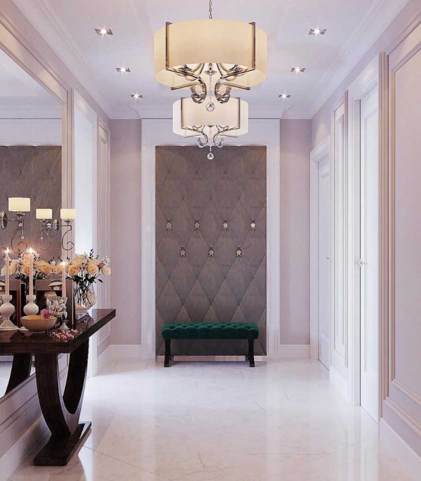Стилистика прихожей должна быть соблюдена даже в осветительных приборах, что позволит подчеркнуть общий дизайн интерьера такого помещения. Люстра может быть выполнена в классическом варианте, в стиле «фьюжн» или модерн. Чтобы достичь гармонии в восприятии интерьера, желательно останавливаться на источниках света соответствующего направления.