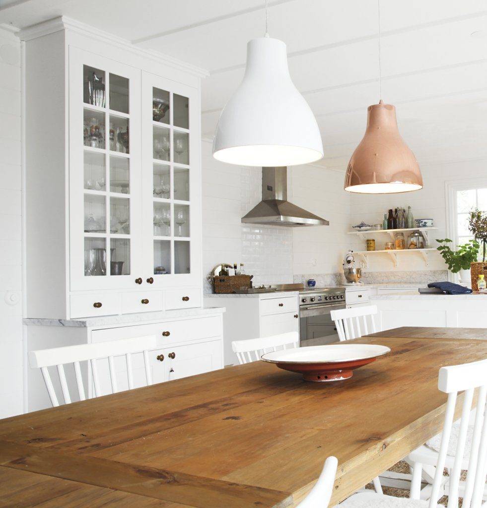 Люстра в стиле скандии на кухне должна иметь высокое качество. Кухня – это комната, в которой часто бывает повышенная температура воздуха и высокая влажность. Предметы интерьера здесь быстро загрязняются, так как на них оседает пар с частичками жира, на который прилипает пыль и все вместе образует грязный налет. Поэтому бумажные люстры непригодны для этого помещения. Для кухни подойдут осветительные приборы, которые можно помыть и очистить от пыли, грязи и жира.