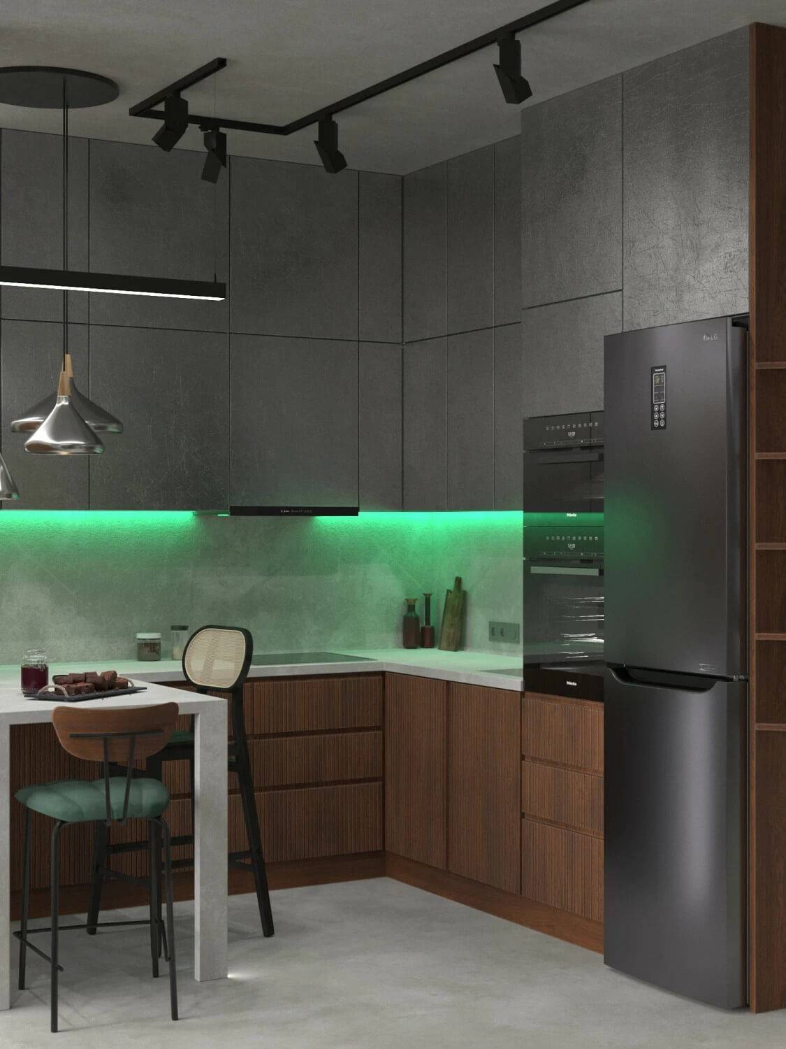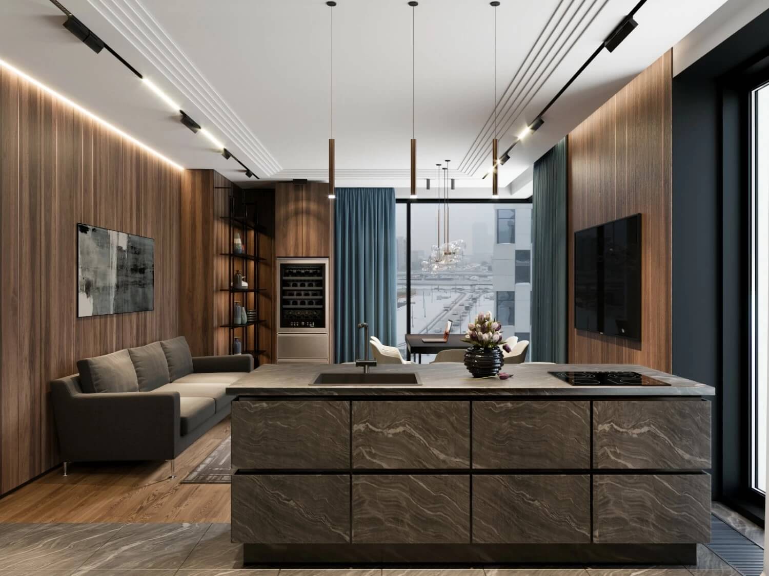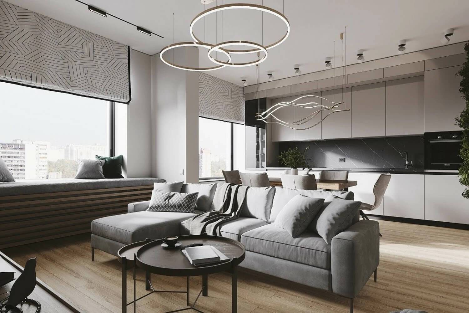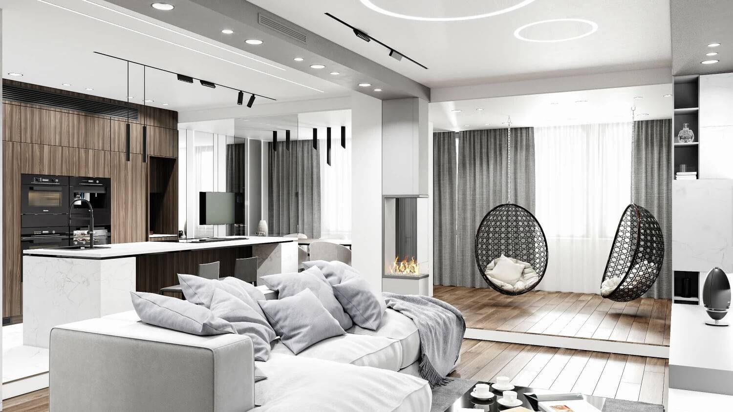 Сложные световые сценарии в совмещённом пространстве кухни-гостиной в проекте квартиры в современном стиле «Береговой», дизайнер Надежда Лашку