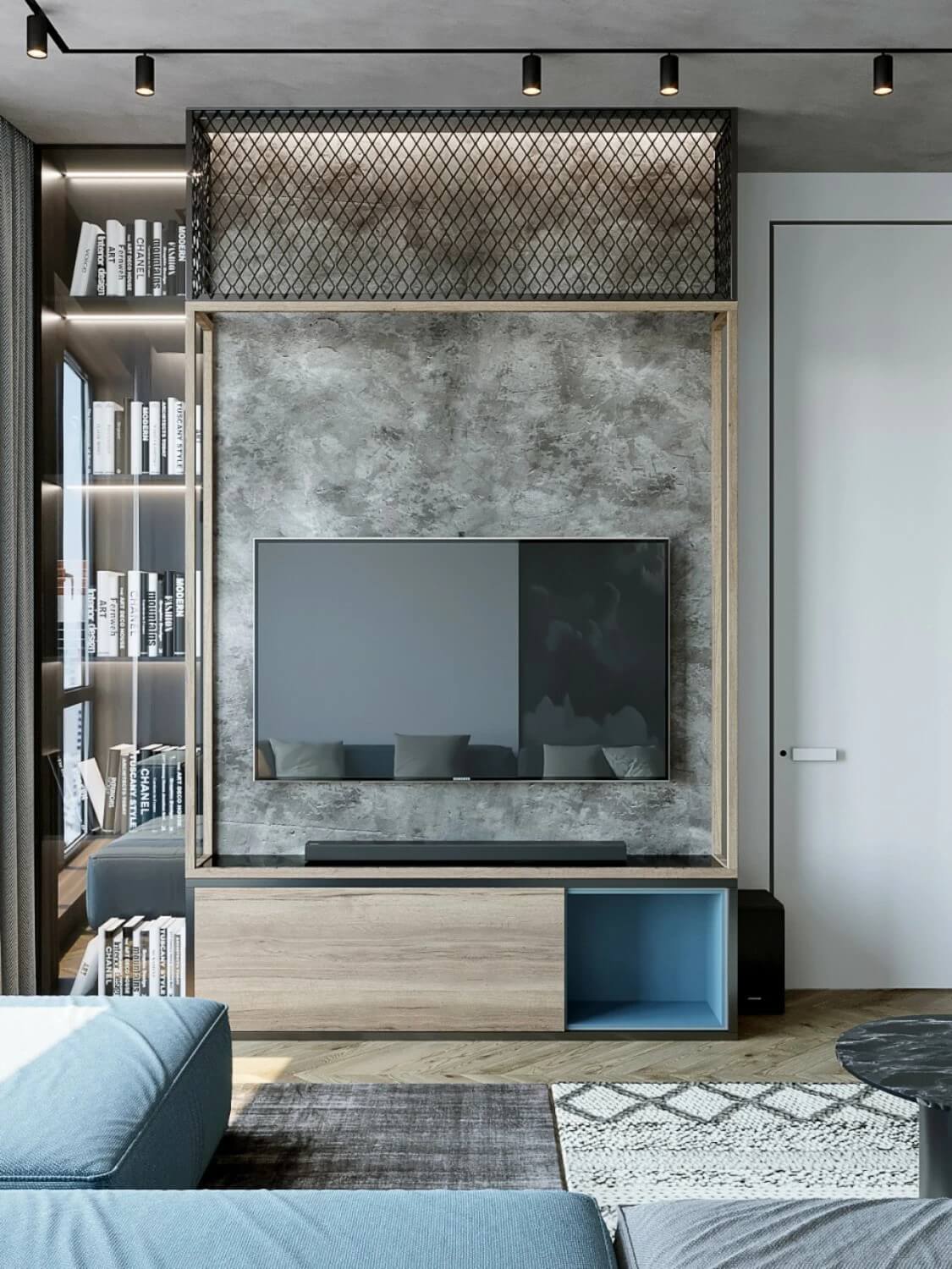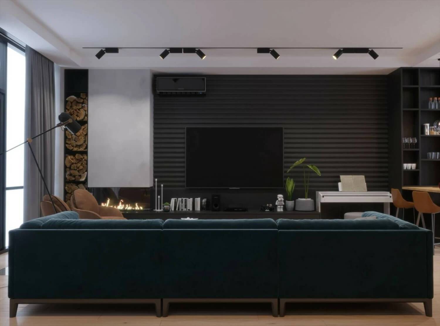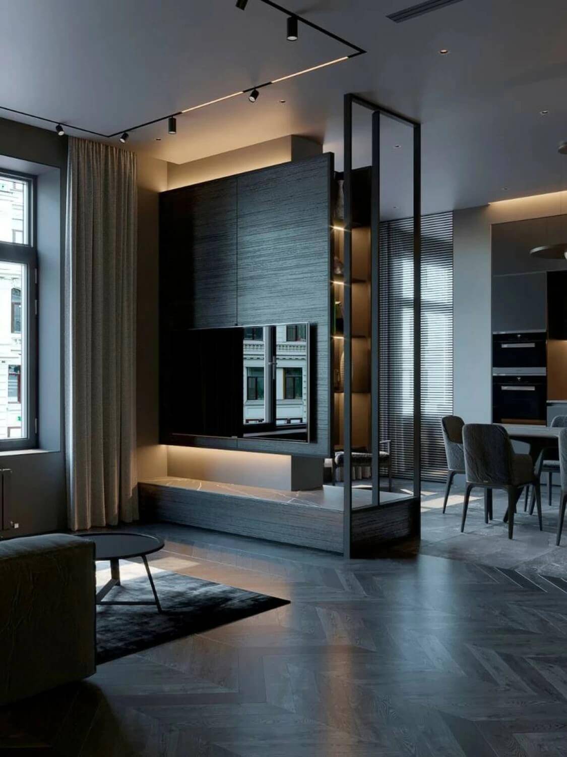 С помощью трекового освещения выделена ключевая зона в комнате. Светильники поддерживают общий брутальный настрой. Проект квартиры с мужским характером “On the Dark Side” (Минск), дизайнеры Игорь и Алёна Скаржевские