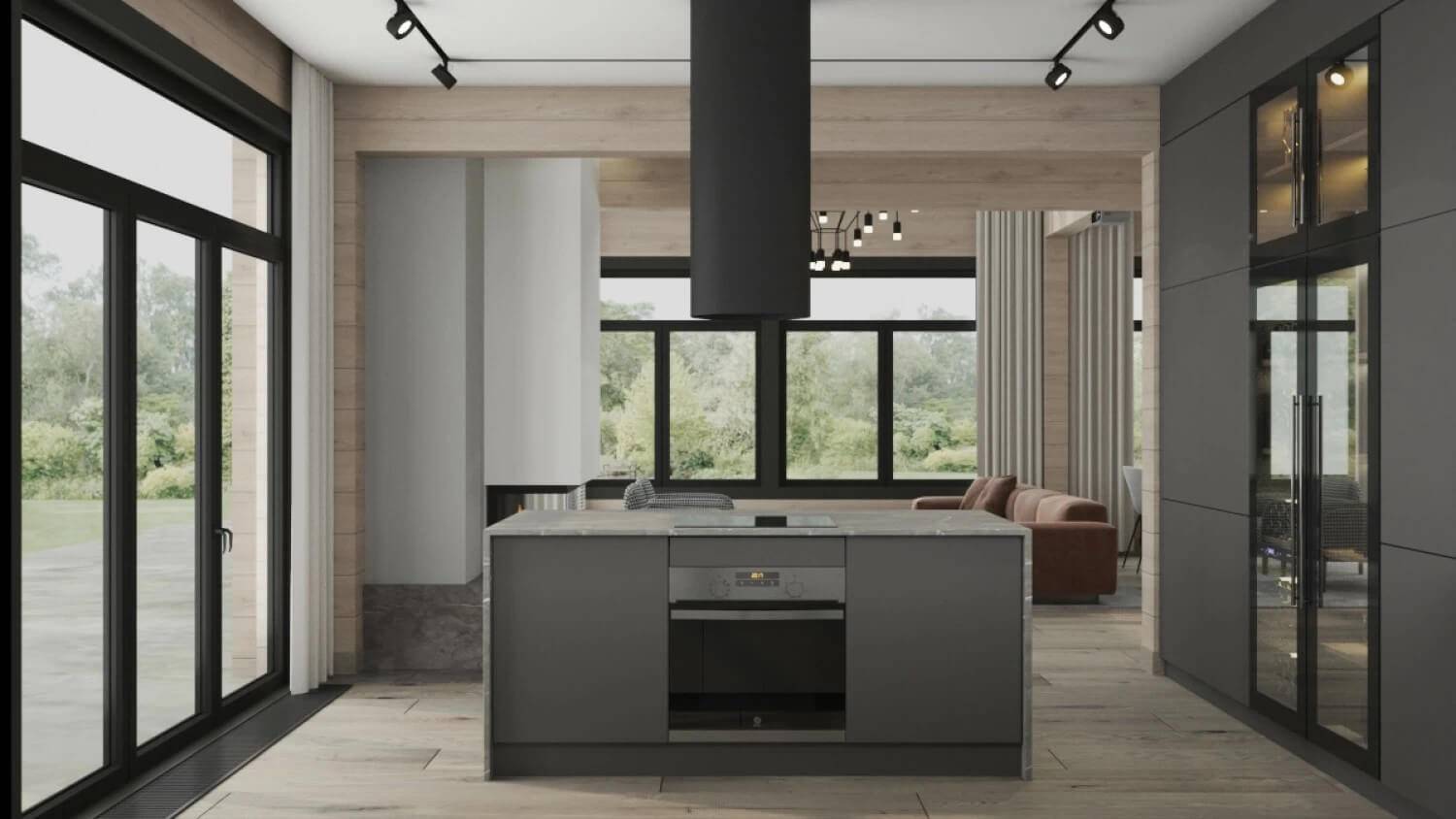Пример зонирования кухни с помощью трековой системы освещения в проекте дома «Гольф», дизайн-студия «Белякова&Караяни»