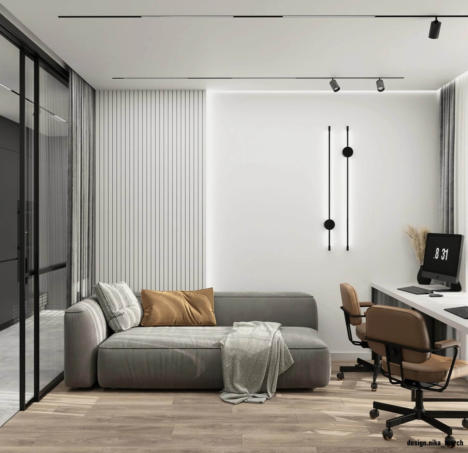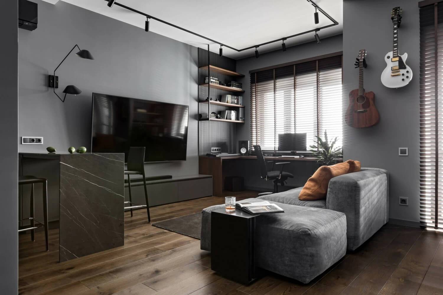 С помощью трековой магнитной системы можно расставить акценты, переключаясь при необходимости с рабочего стола на зону отдыха — и наоборот. Проект квартиры “Grey Fox”, дизайнер Ника Марченко