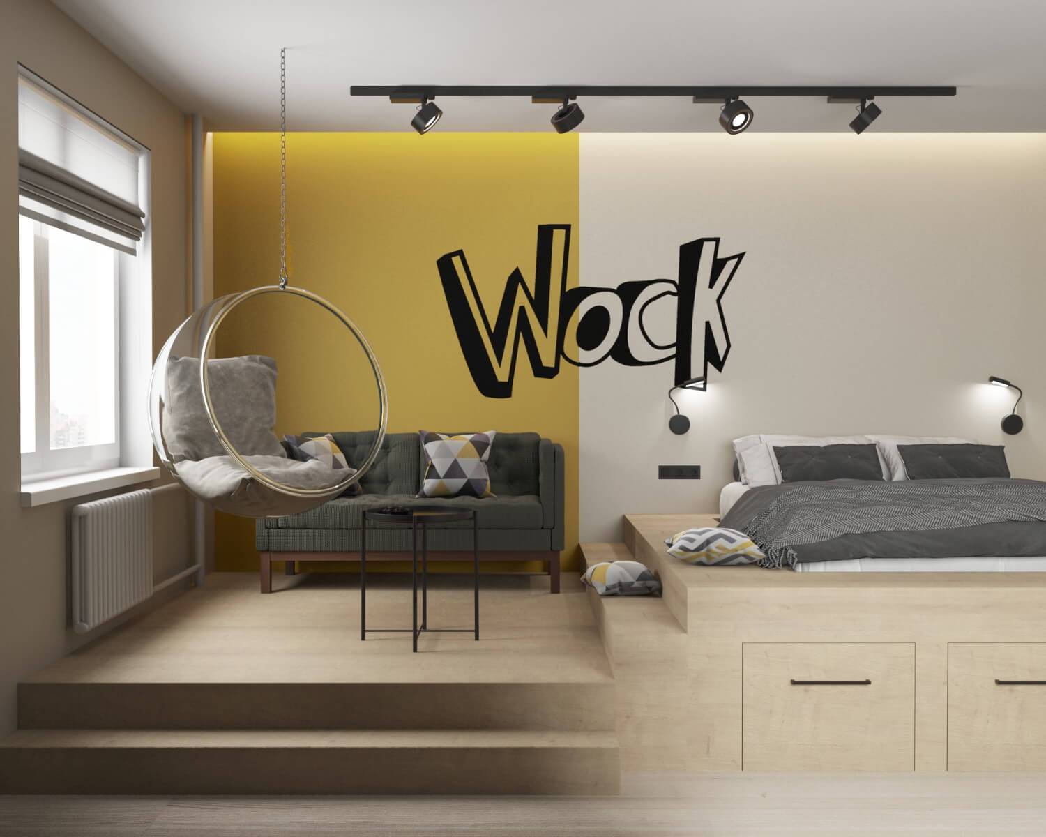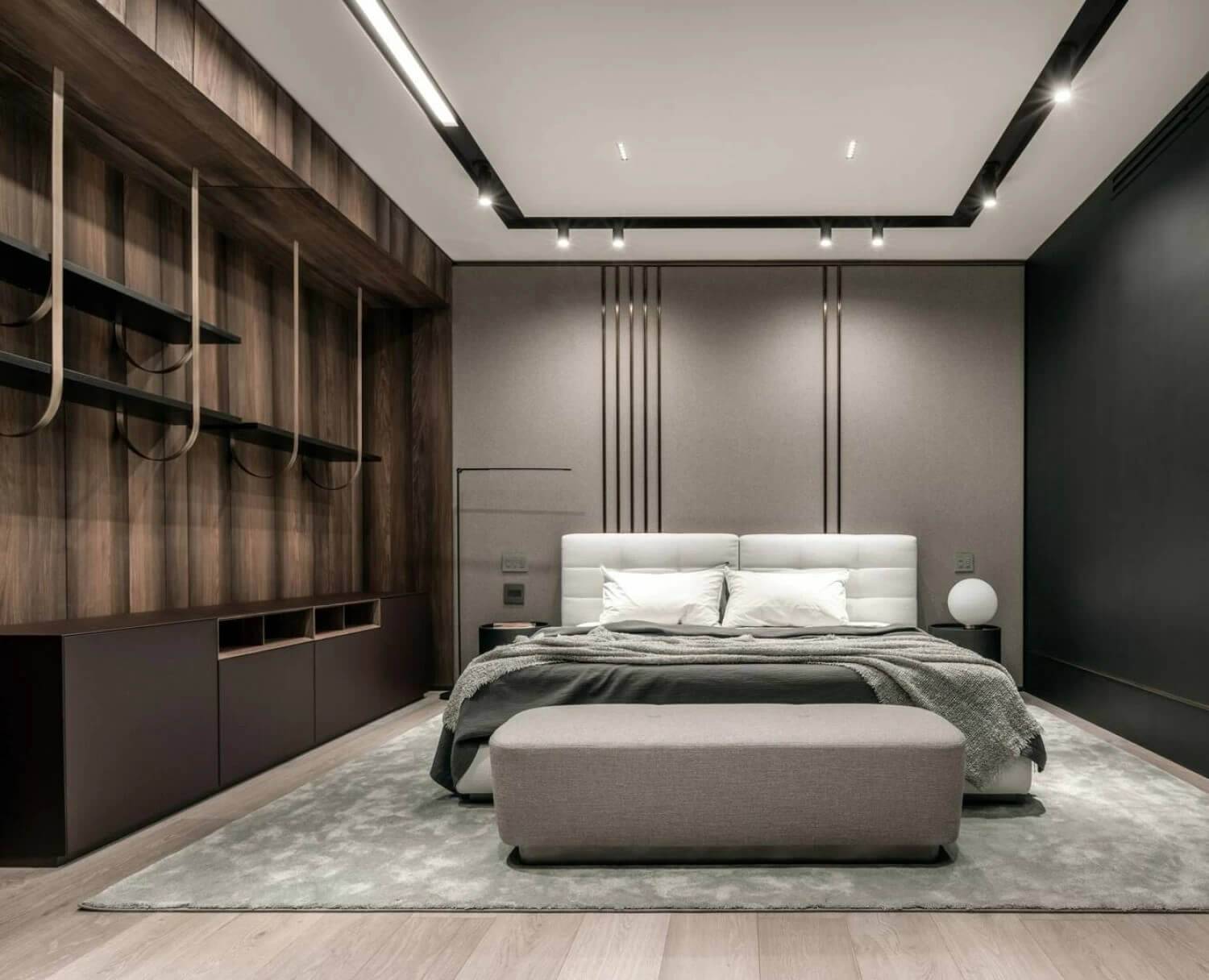 Широкий профиль трековой системы придаёт брутальный характер минималистичной спальне. Интерьер квартиры «Нефрит, Флорида», студия Yodezeen