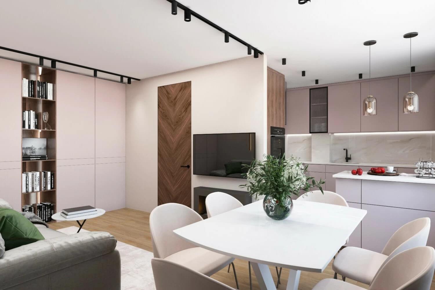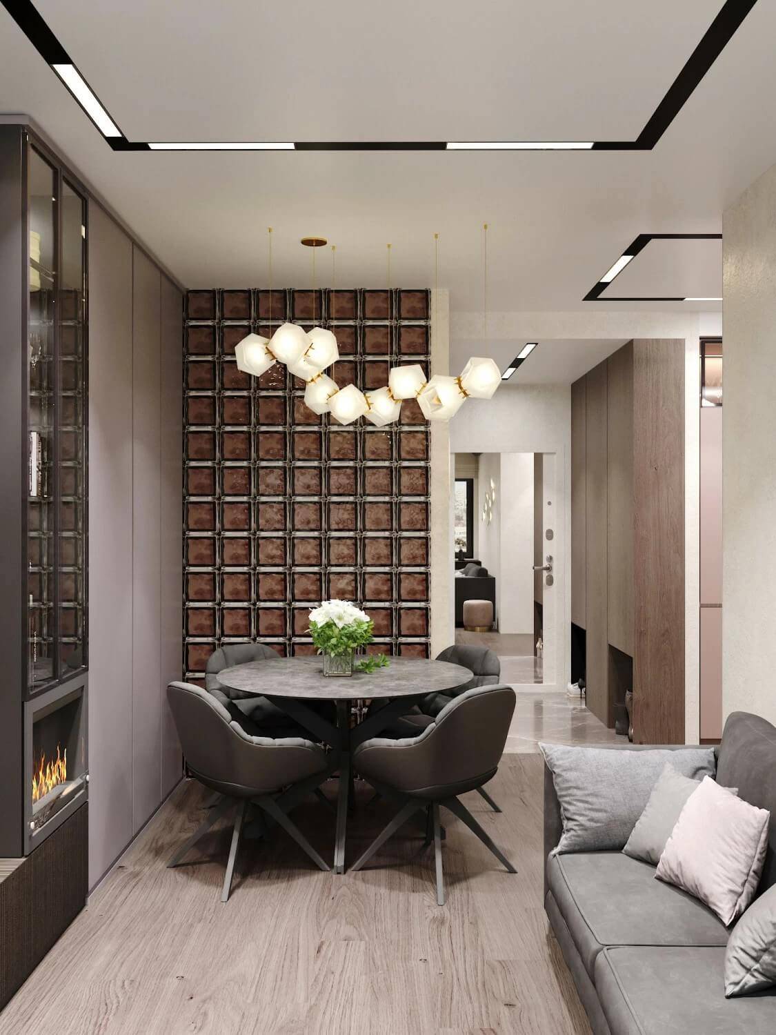 Зонирование пространства с помощью плоских трековых светильников в интерьере квартиры в ЖК «Сиреневый Парк», дизайнер Елена Нижегородова