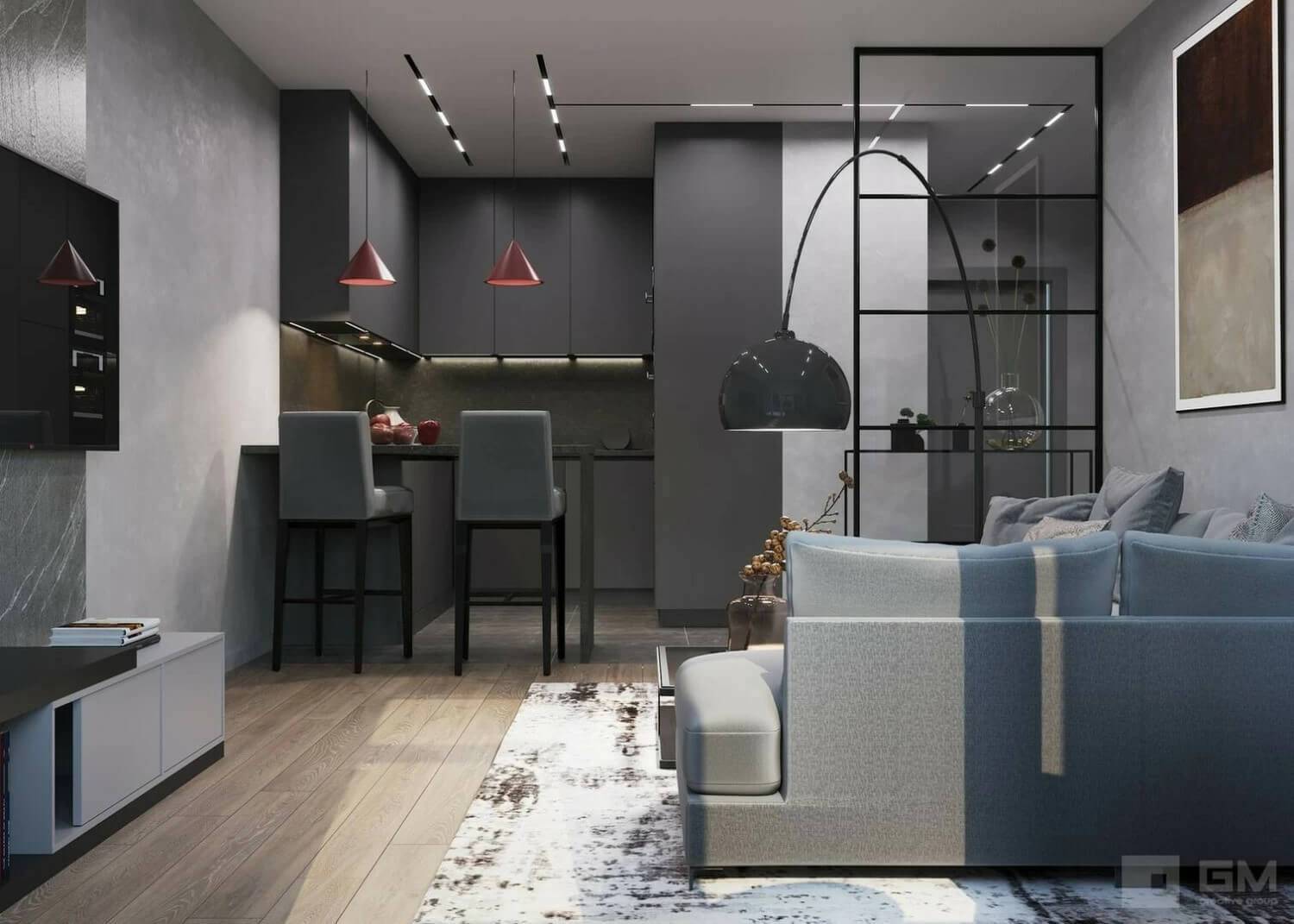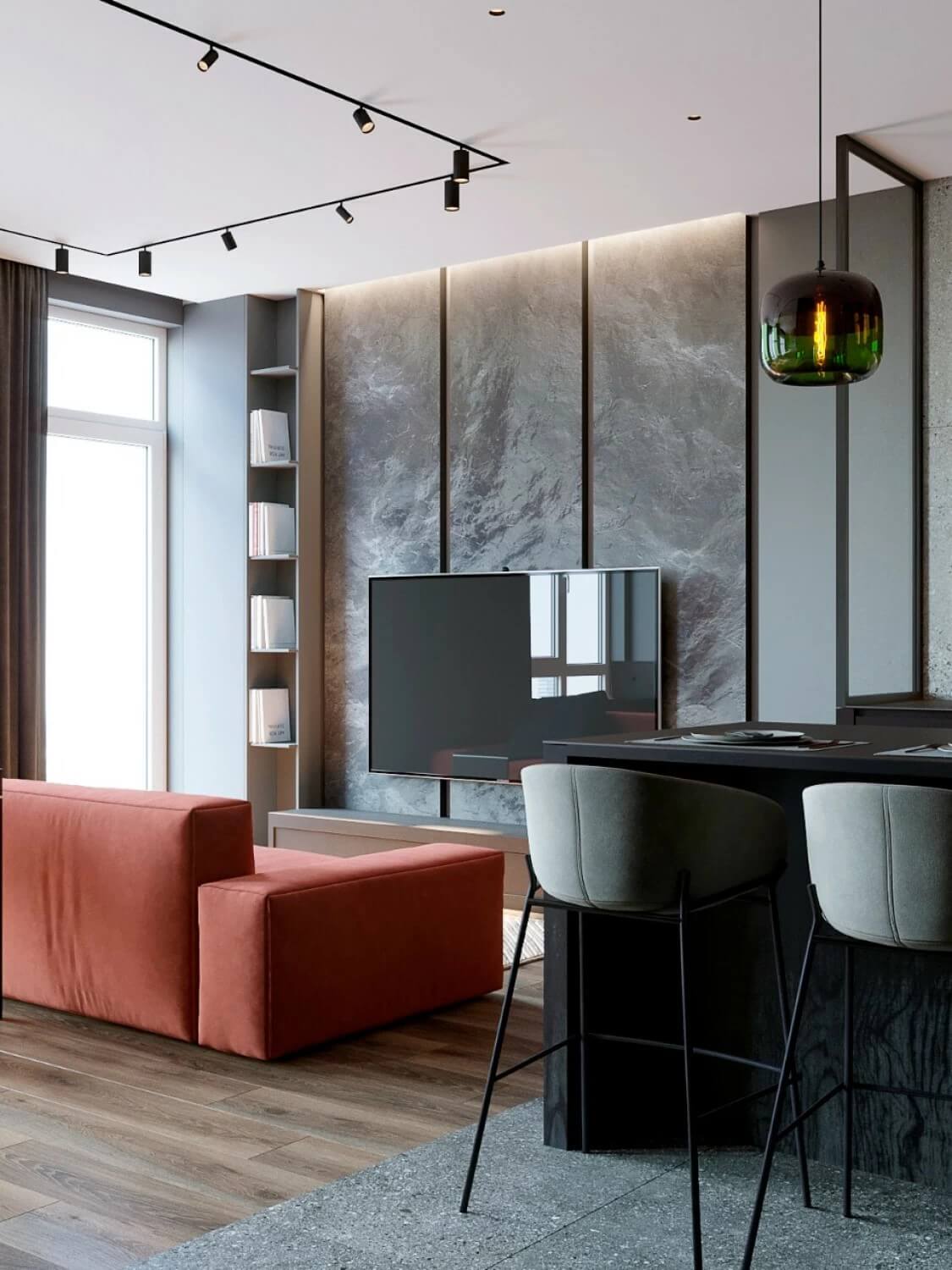 Трековое освещение зоны приёма пищи — барной стойки. Проект кухни-гостиной для квартиры в ЖК «Грин парк», дизайнер Павел Алексеев