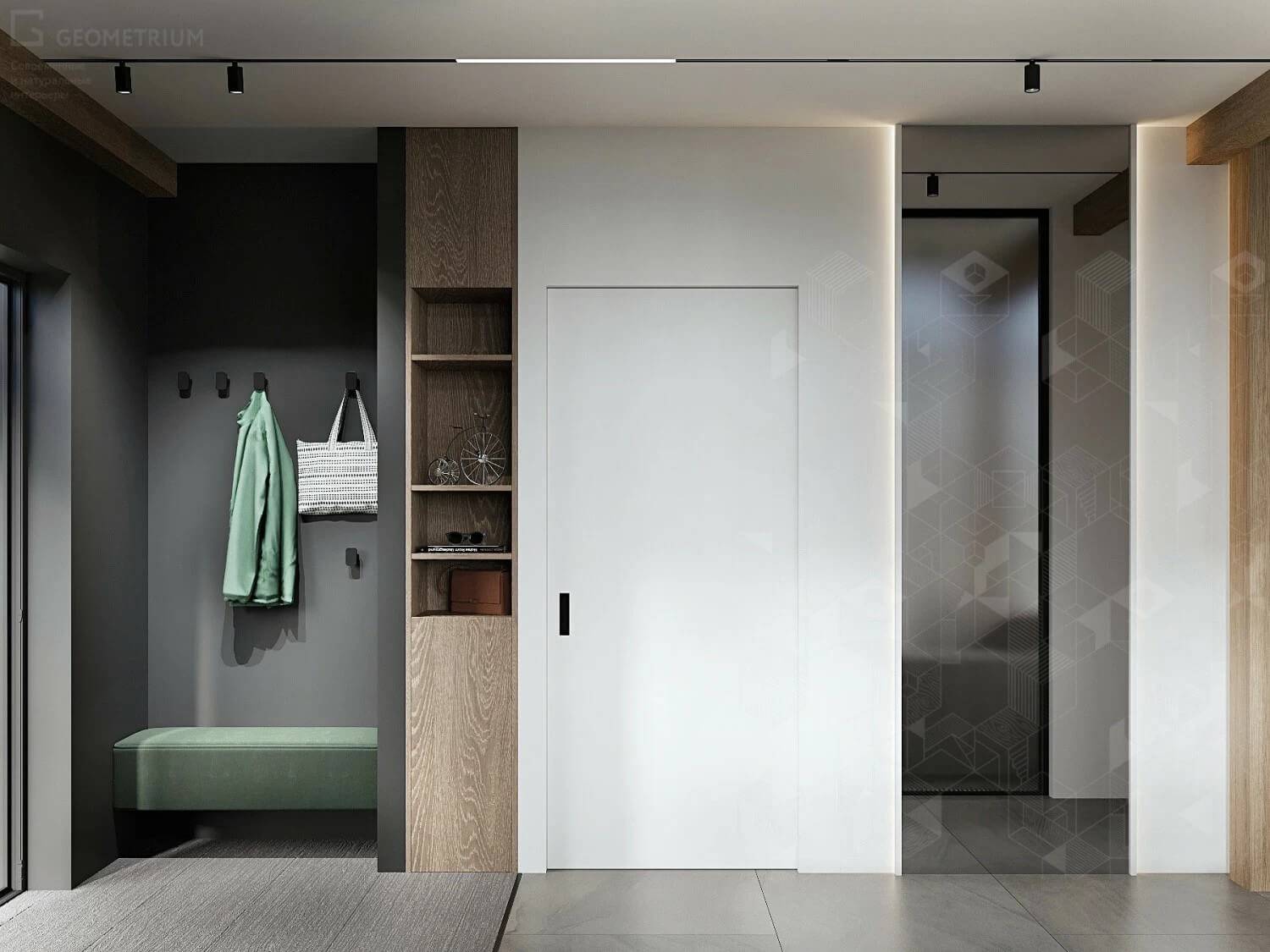 Трековая система с интегрированной световой линией в проекте интерьера прихожей современного дома с элементами эко и регионализма в частном доме «Фахверк Гринвуд», дизайнер Павел Герасимов