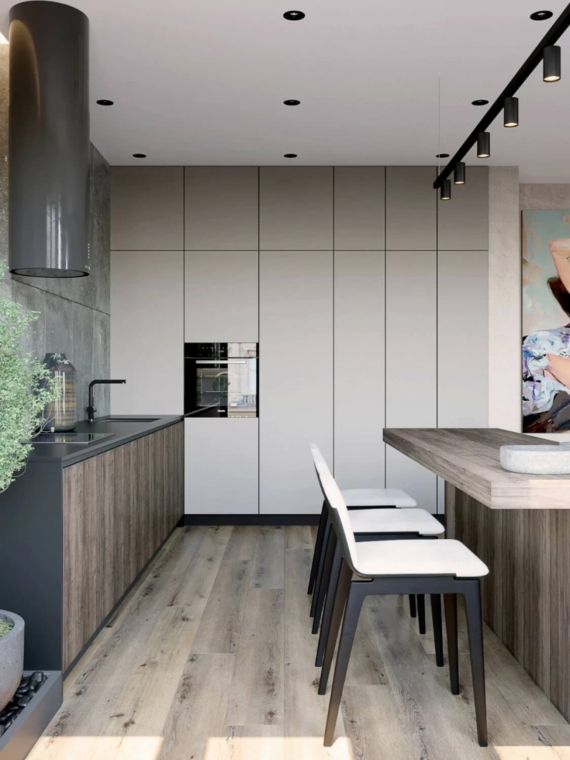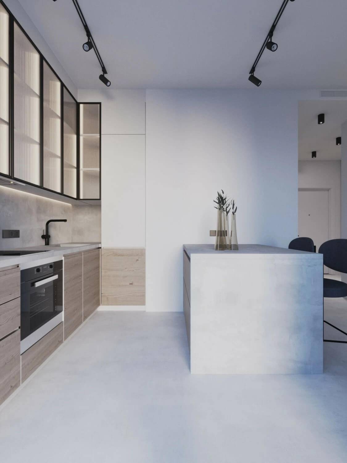 Минималистичные трековые светильники в интерьере светлой кухни. Проект квартиры «01», дизайнер Елизавета Ашкенази
