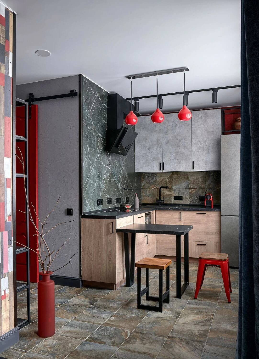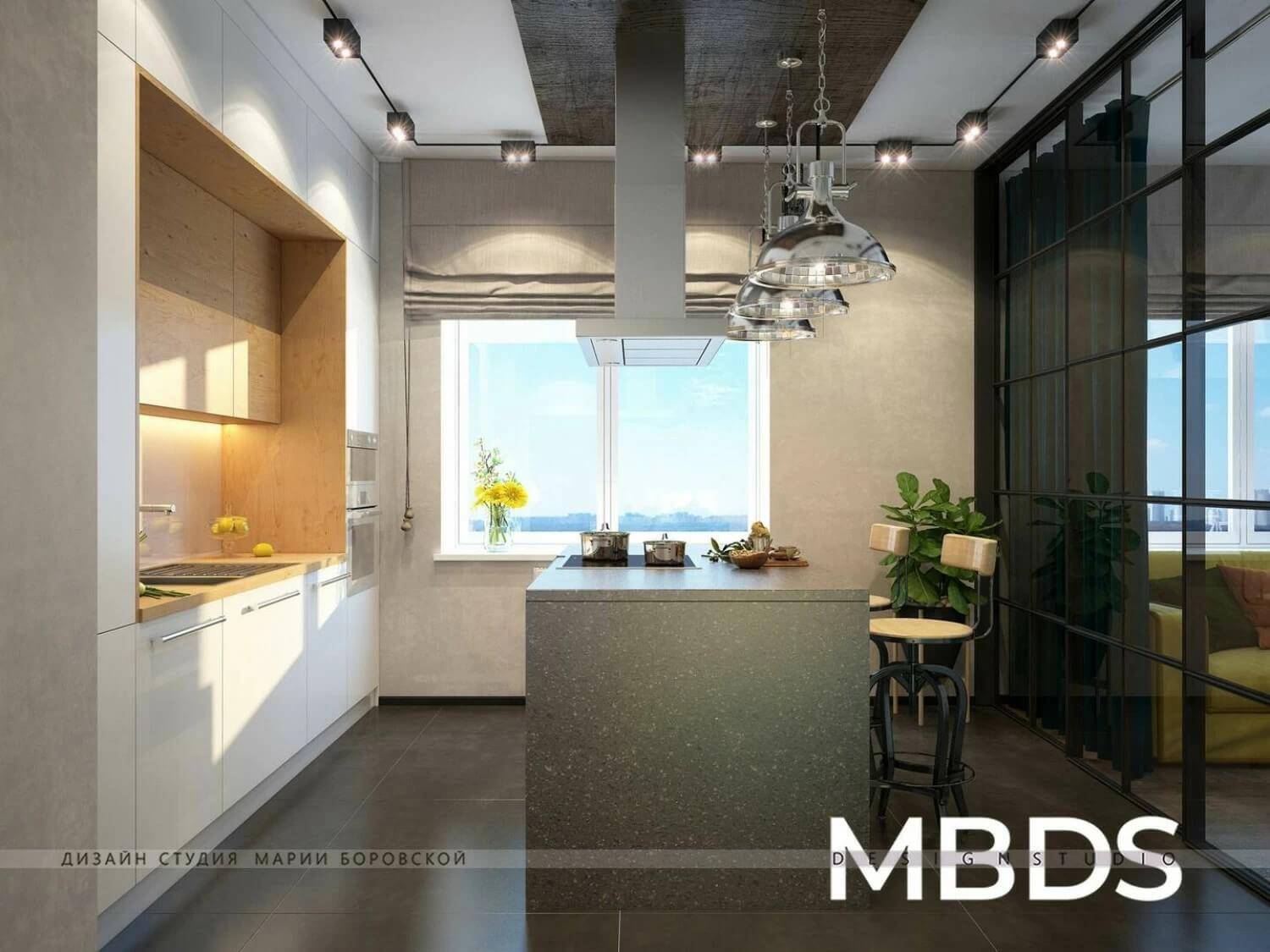Трековые светильники в интерьере кухни: система использована для подсветки рабочей зоны. Проект квартиры-студии для молодого человека, дизайнер Анна Новикова