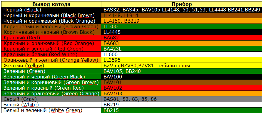 Запомнить все сочетания практически невозможно. Если усвоить хотя бы основные соответствия, разобраться в назначении диода удастся гораздо быстрее.