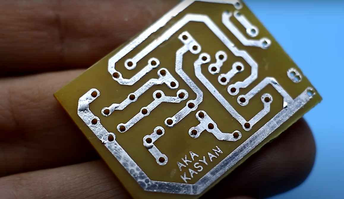 Переводим распечатанный дизайн платы на медную пластину при помощи лазерного принтера. В итоге получаем зеркальное отображение конструкции платы. Заполняем плату элементами: добавляем транзисторы, конденсаторы, резисторы, провода питания, катушки. Наматываем на катушку витки. Настраиваем частоту для катушек.