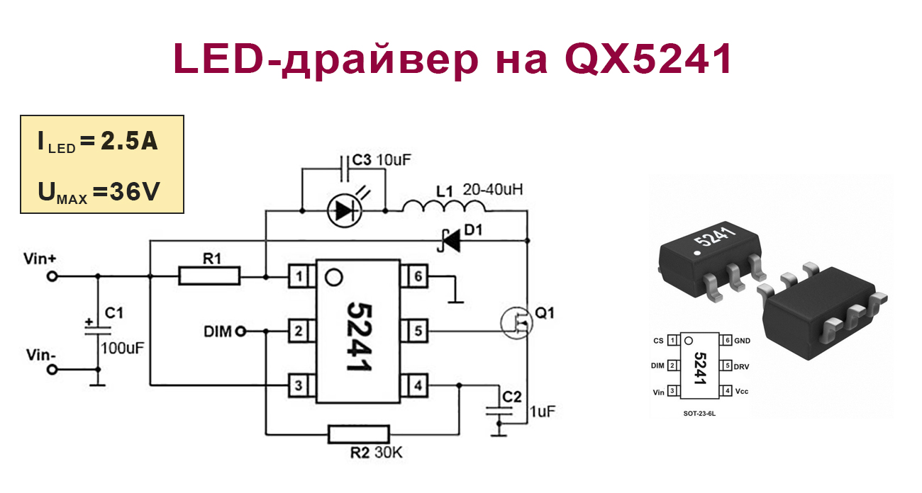Светодиодный драйвер на QX5241 содержит мало деталей и собирается всегда по такой схеме: