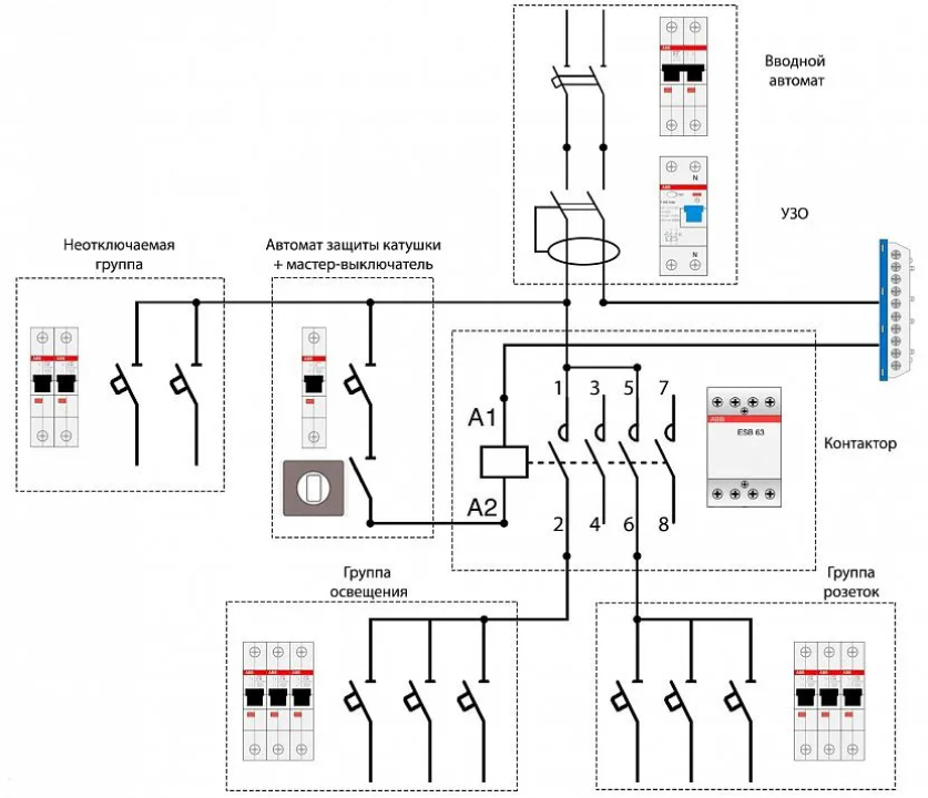 Давайте разберемся со схемой подключения мастер-выключателя через контактор. Эта схема обычно используется на промышленных объектах или в больших зданиях, где необходимо управлять большими мощностями или обеспечить дополнительную безопасность.