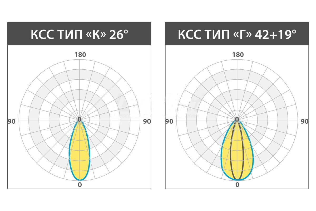 Кроме того существуют определенные правила, касающиеся светильников для архитектурной подсветки. Они должны быть только наружными и иметь определенный тип кривых сил света (КСС). КСС обозначают зону максимальной направленности светового потока. Для архитектурной подсветки лучше выбирать источники света с КСС типов К/Г (Подробнее в ГОСТ Р 54350-2015 «Приборы осветительные. Светотехнические требования и методы испытаний»). Угол рассеивания таких ламп не превышает 60⁰.