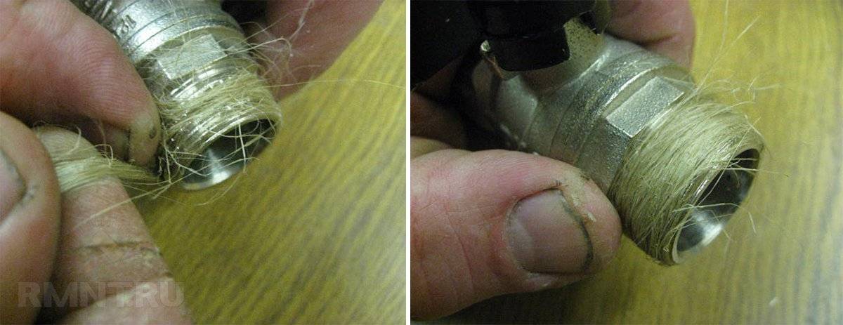 При работе с трубами и фитингами нельзя обойтись без уплотнения резьбовых соединений. Как ни мудрили учёные мужи, изобретая альтернативные материалы для подмотки, а традиционный лён никому превзойти не удалось! Но в подмотке льном есть некоторые хитрости и кое-какие технологические новшества. Так, для надёжной фиксации льняной подмотки, нужно взять пучок подлинней, сделать на одном конце его петлю наподобие удавки, которую накинуть на конец резьбы, затянуть её, а свободный остаток намотать по ходу резьбы.
