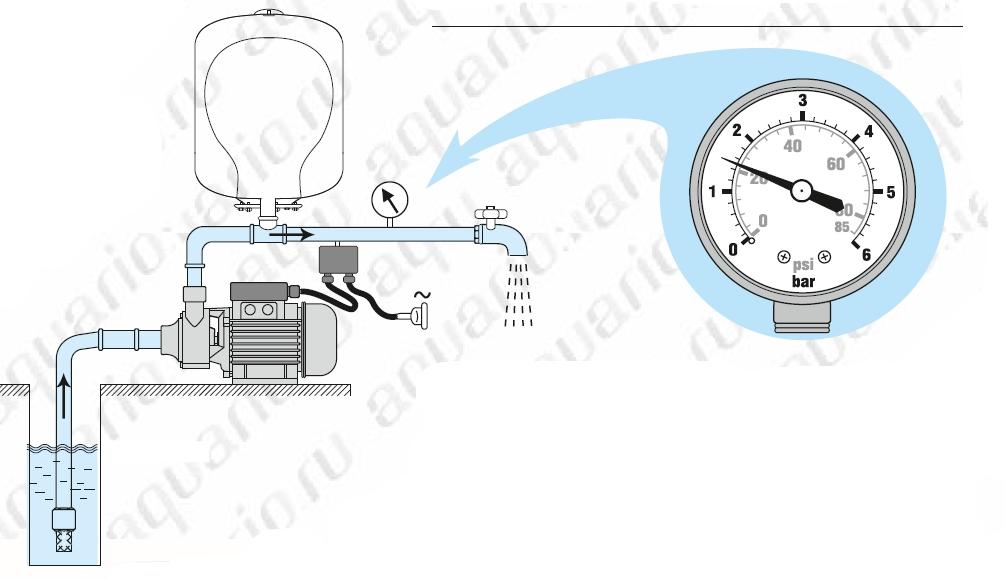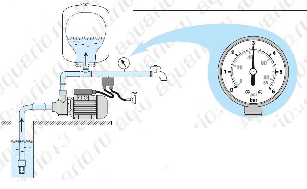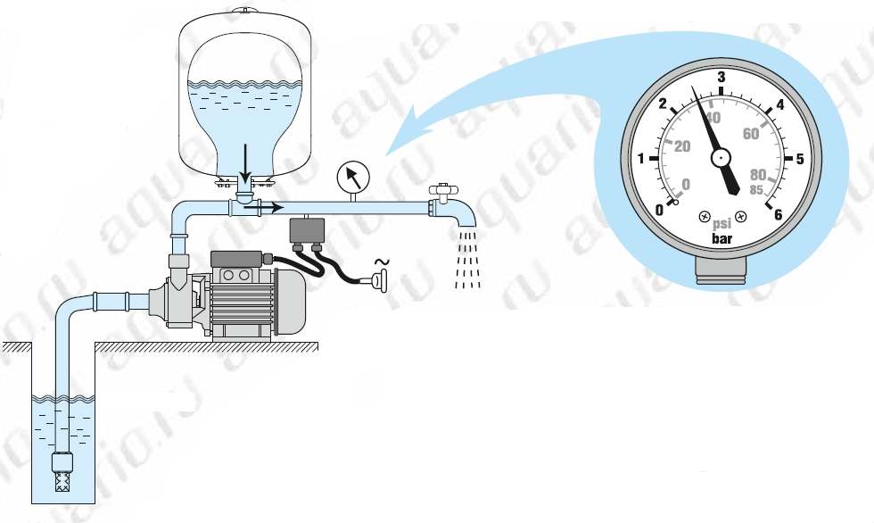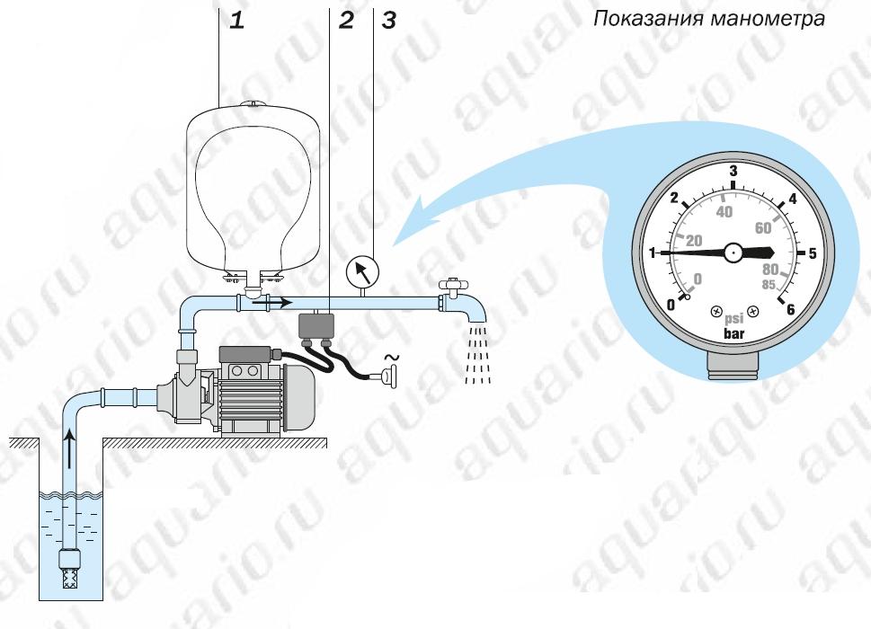 При запуске насосной станции и пользовании водой насос включается автоматически и начинает качать воду потребителю.