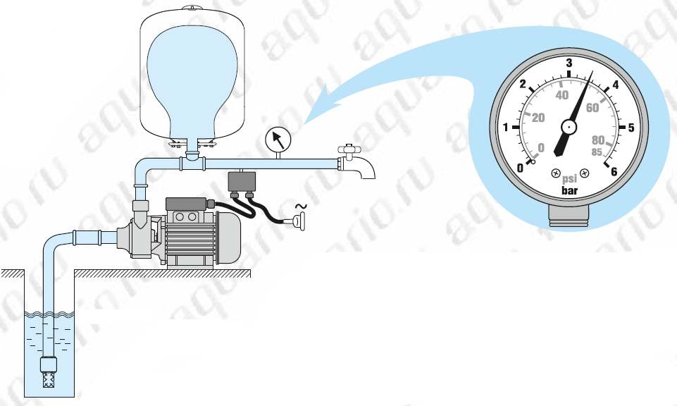 После того, как давление достигнет определенного (настроенного заранее) значения (давление отключения), реле выключит насос.