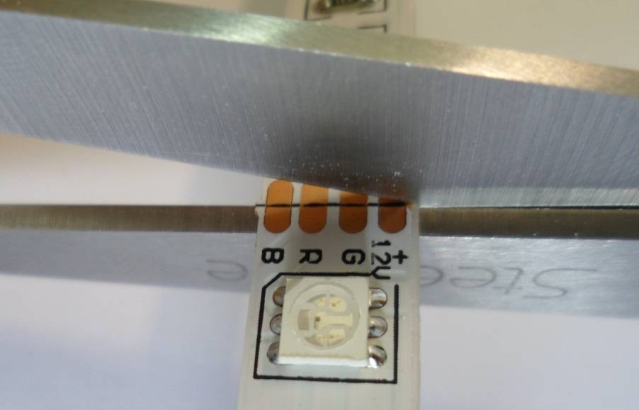 Часто случается, что необходимо подключить к сети только небольшую часть ленты, а не все 5 метров, как в стандартной катушке. В этом случае, она разрезается по заранее обозначенному на ней месту. Обычно, леска реза наносится через каждые три светодиода. Это связано с тем фактором, что они последовательно запараллеливаются по три штуки.