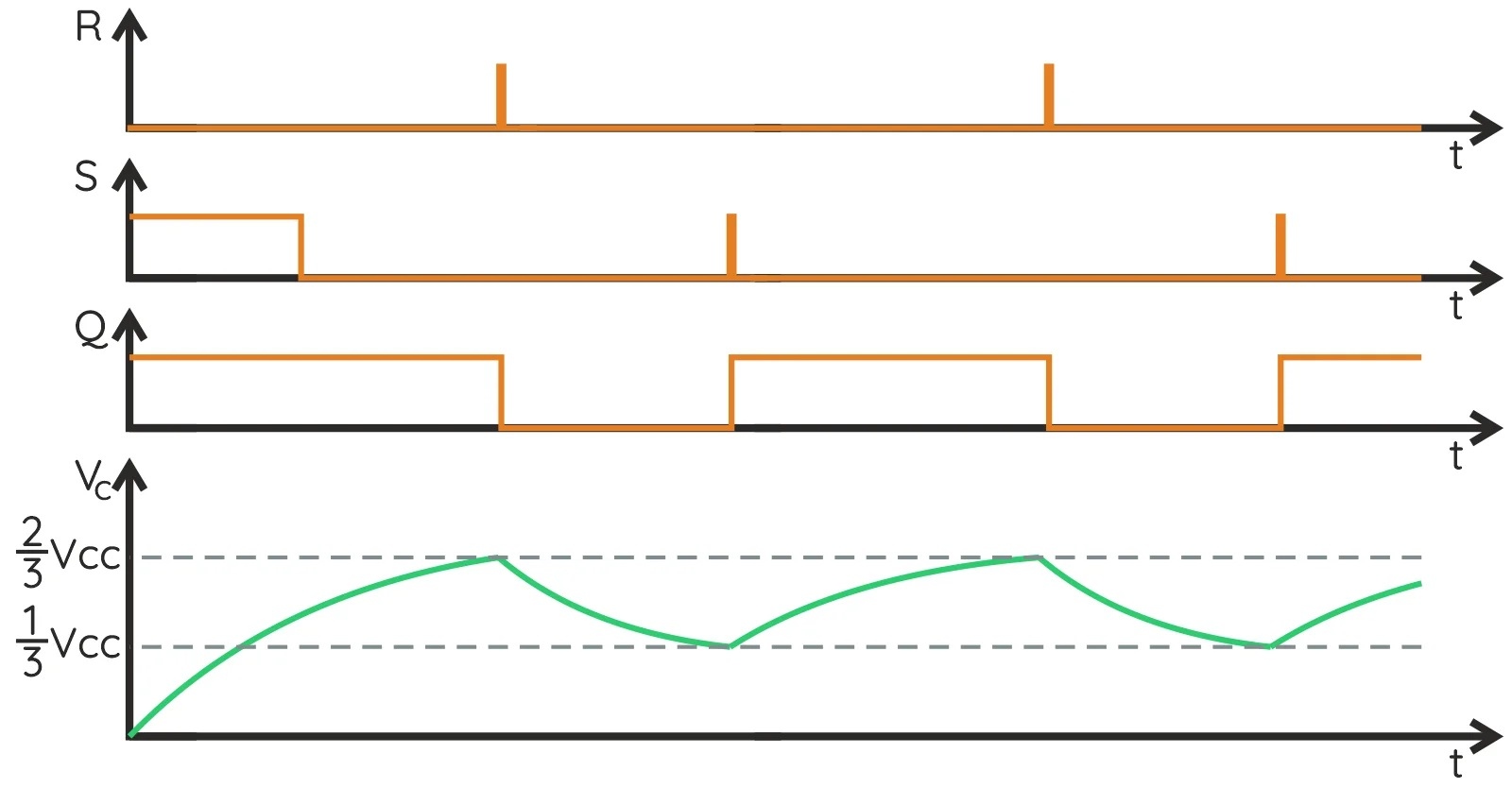 Описание дополняется схемой хронологии наиболее важных напряжений в цепи: на конденсаторе, на выходе схемы и на входах триггера. Зарядка и разрядка конденсатора происходит дугой, поскольку конденсатор, питаемый резистором, изменяет свое напряжение экспоненциально.