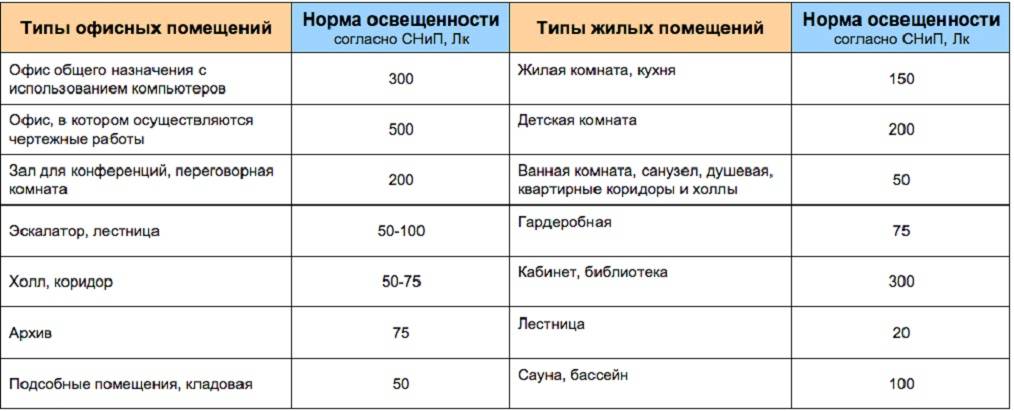 Соответственно, свои нормы освещенности есть для детских садиков, жилых помещений, медицинских учреждений, автомоек и так далее.