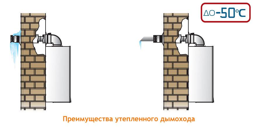 Дымовая труба в его конструкции должна иметь длину до 5 м. Если она направлена на улицу, ей придают уклон из расчета по 1 см на каждый метр ее длины. Для условий российского климата больше подходят утепленные варианты со следующими внесенными в конструкцию изменениями: