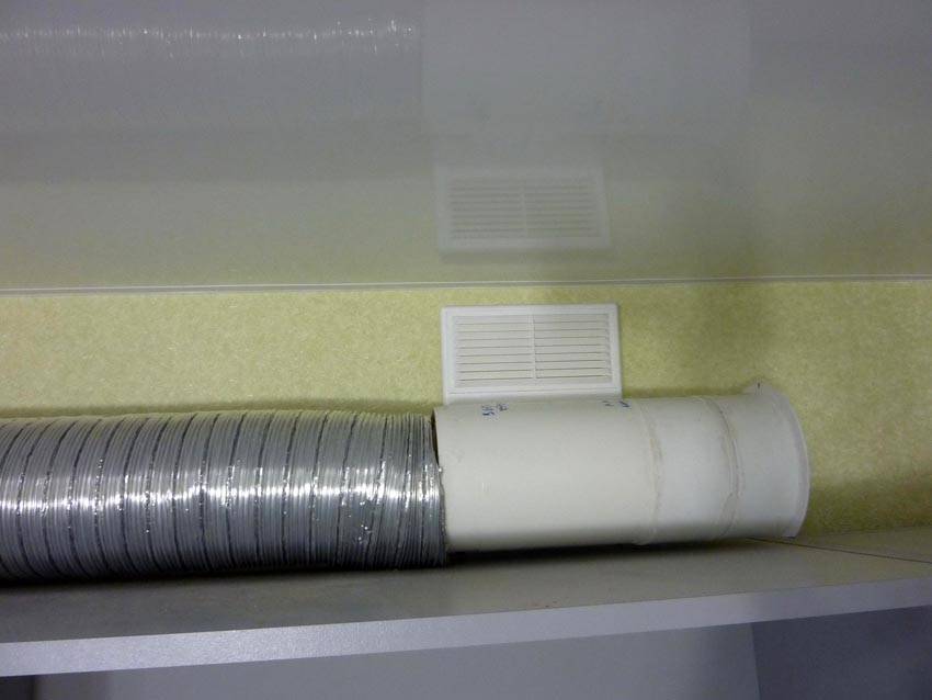 - Тройник лучше располагать на вертикальном участке воздухопровода, а не под самым потолком. Тогда вы сможете соорудить декоративный короб и полностью спрятать трубу.