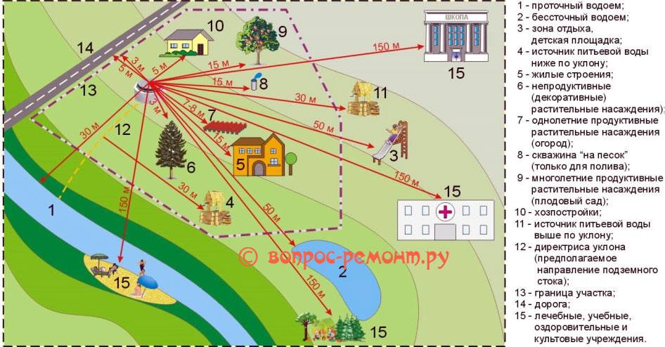 Расположения скважины и выгребной ямы – не единственный параметр, учитываемый при определении их места расположения. В новом законе о дачах, СанПиН 42-128-4690-88 и других регламентирующих документах есть строго очерченные правила об удаленности сооружений от других строений на участке:
