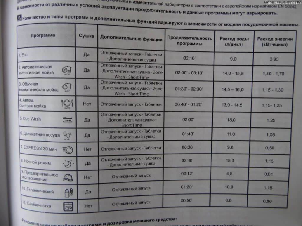 Экономичная программа заключается в предварительном замачивании столовых приборов, обмывом при температуре 50 градусов, ополаскиванием с двойной сменой воды и окончательным высушиванием посуды. Ждать окончания этой программы придется дольше — примерно 2,5 часа.