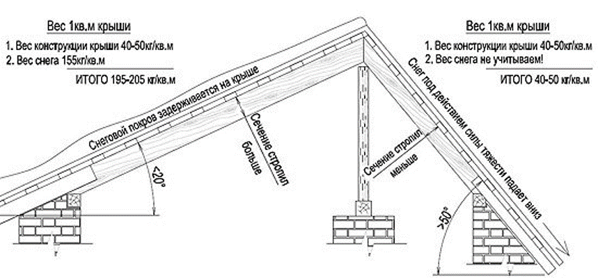- для снижения снеговой нагрузки (обеспечение соскальзывания снега) следует увеличивать угол.