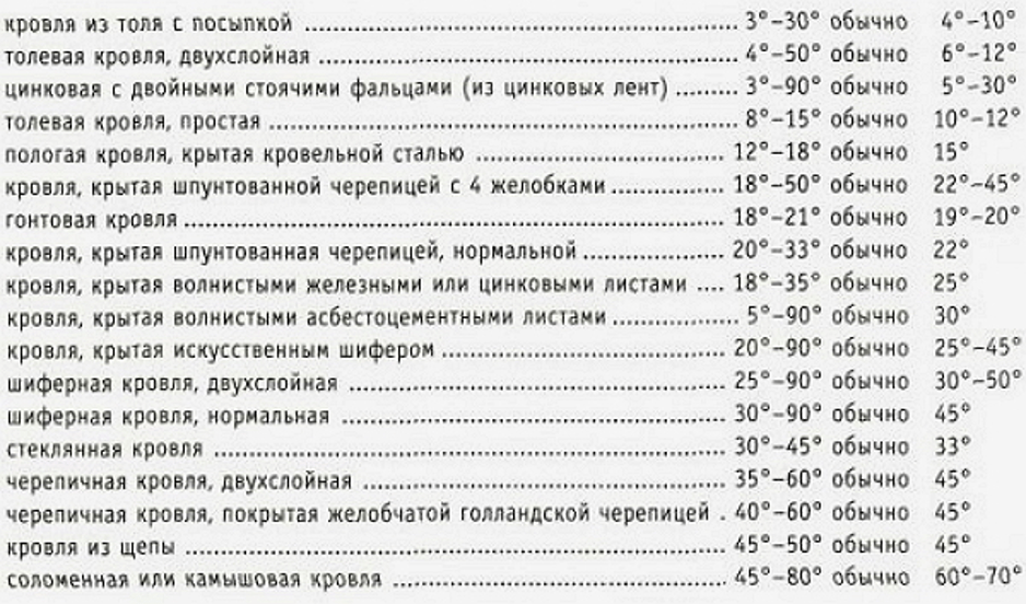 Более детально перечислены допустимые и обычно применимые углы кровли для разных материалов в таблице ниже.