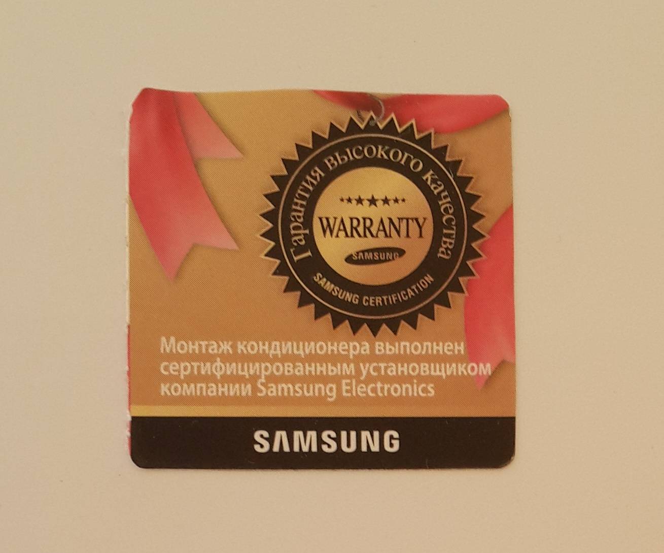 Как уже говорилось, компания Самсунг даёт трёхлетнюю гарантию на кондиционеры, смонтированные сертифицированным установщиком. Список таких установщиков есть на сайте компании. Их не много, и цены на установку, мягко говоря, выше средних. Обращаться к ним или нет, решать клиенту. Стоит отметить, что сертифицированный установщик обязан оставить на кондиционере специальную наклейку (она показана на фото). Её наличие проверяют сотрудники Самсунг, если речь идёт о получении расширенной трёхлетней гарантии. Иными словами, если кондиционер сломался в течении года, его починят бесплатно вне зависимости от наличия наклейки. Если же с момента установки прошло от года до трёх лет, без наклейки бесплатного ремонта не будет.