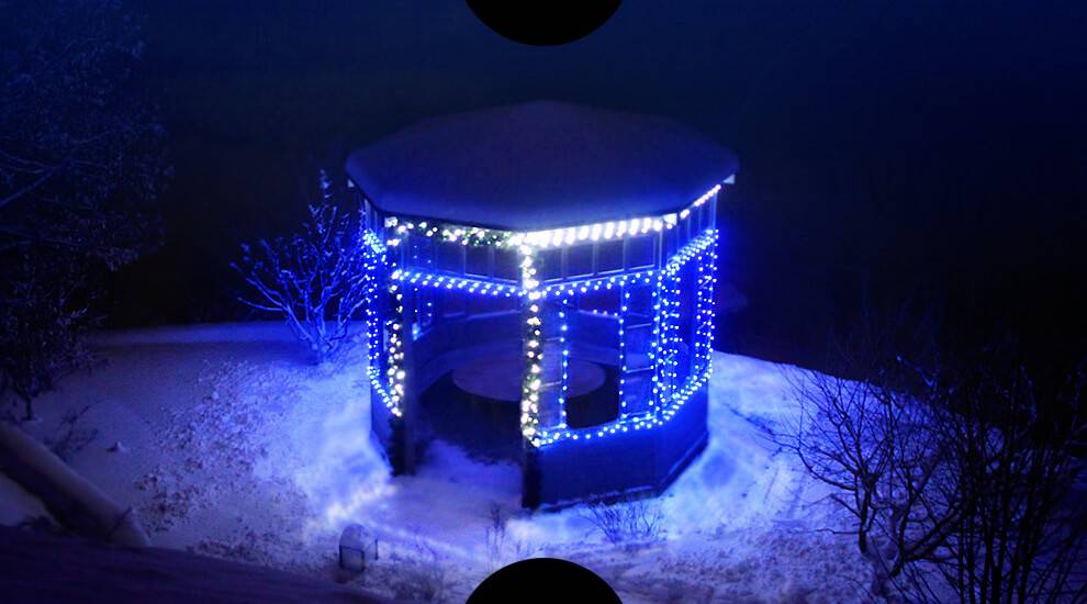 Для более праздничного экстерьера, для придания беседке жизнерадостного вида натяните гирлянду в два ряда — и вы получите эффект торжественности. Здесь главное контролировать яркость света. Если выбрать слишком мощные лампочки, вы не добьетесь той самой атмосферности, потому что свет будет слепить и резать глаза