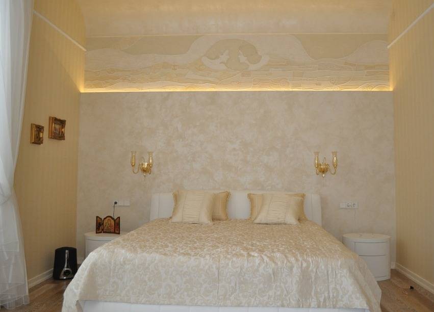 В современных интерьерах квартир часто используется отделка панелями «под дерево». Если установить у изголовья дивана парочку настенных бра и несколько точек над платяным шкафом, то этого достаточно, чтобы обеспечить комфортный уровень освещенности, не прибегая к использованию люстры или светодиодной ленты.