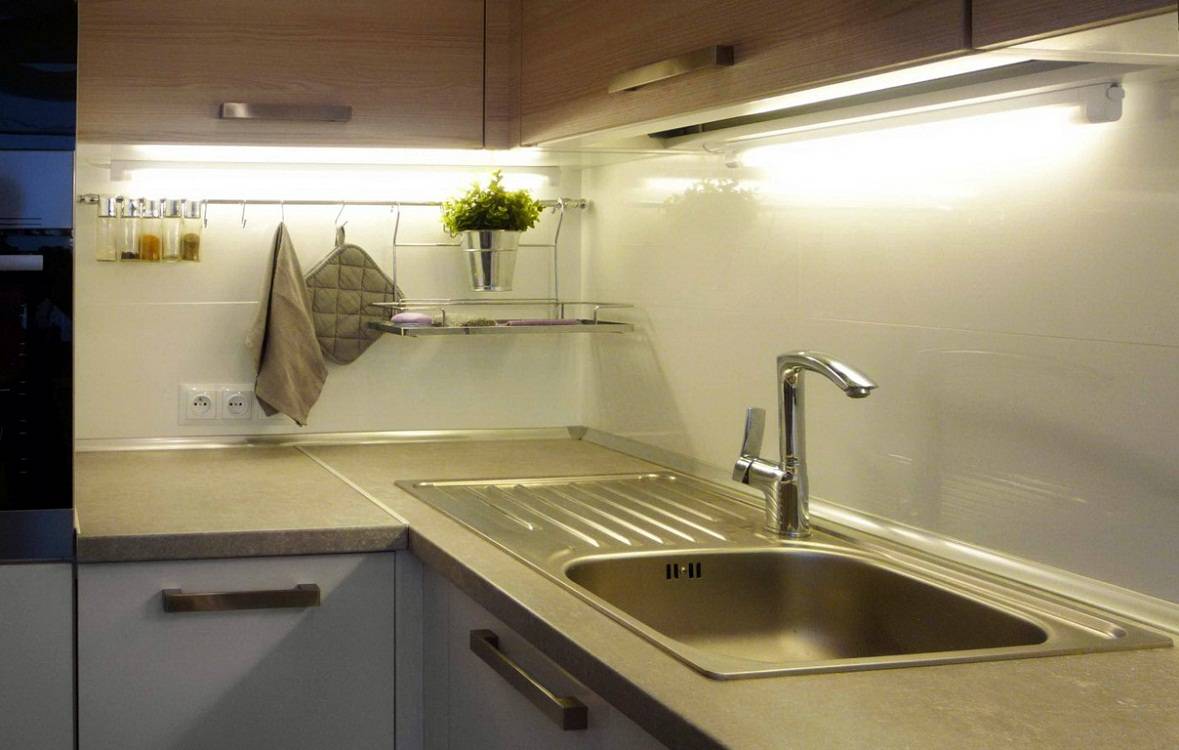 Главное условие: над уровнем рабочей поверхности столешницы освещенность должна быть не менее 300 Лк. Допускается уменьшение освещенности рабочей зоны, если в помещении кухни достаточно дневного света.