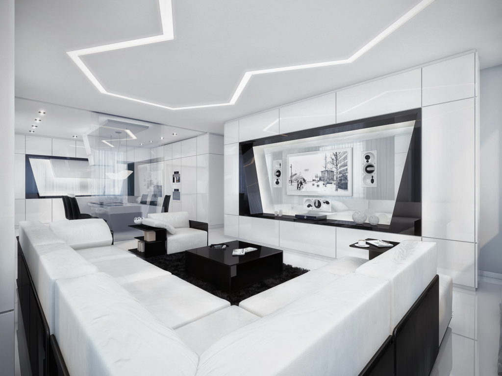 Для современных стилей допускается любая их комбинация, такая гостиная сочетает в себе элементы стилей минимализм, модерн и хай-тек или лофт и значительно расширяет пространство для маневров и свежих идей.