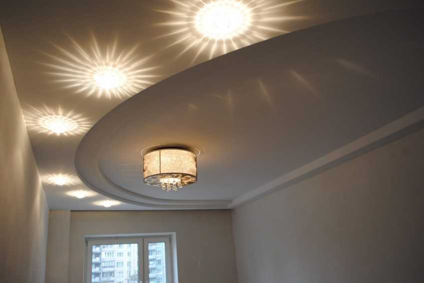 Всем точечным светильникам нужно пространство, поэтому натяжные потолки с подсветкой такого рода опускаются сильнее. Насколько именно — зависит от размеров и типа осветительного прибора. Чтобы не уменьшать высоту всей комнаты, иногда делают двухуровневую конструкцию и врезают споты в нижний ярус.