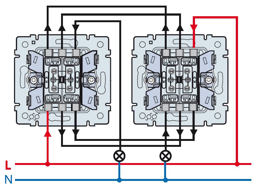 Схема подключения двухклавишных проходных выключателей
