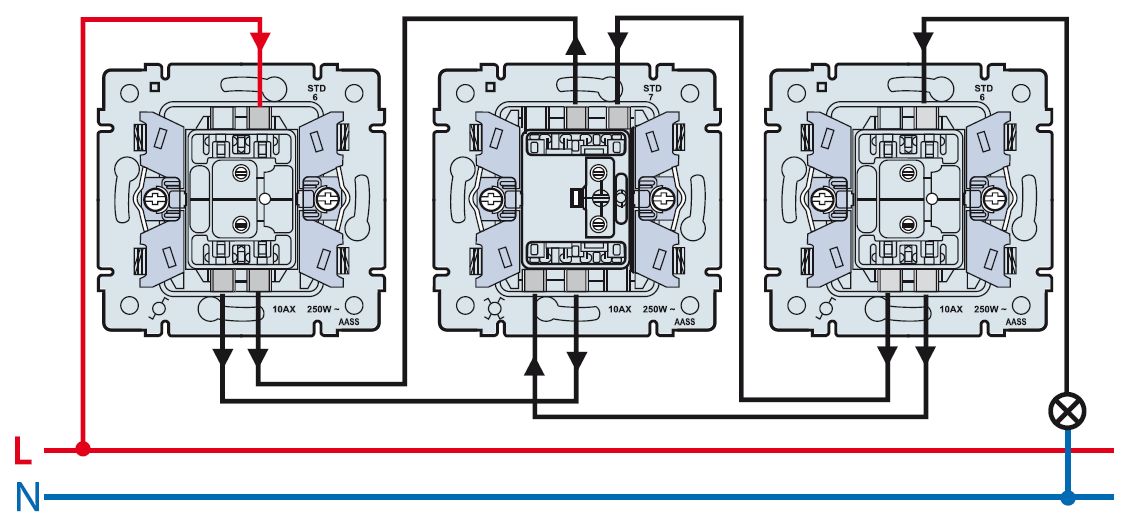 Схема соединения выключателей между собой: посередине — крестовой с 4 контактами для соединения остальных переключателей между собой