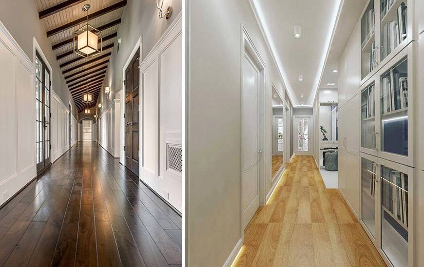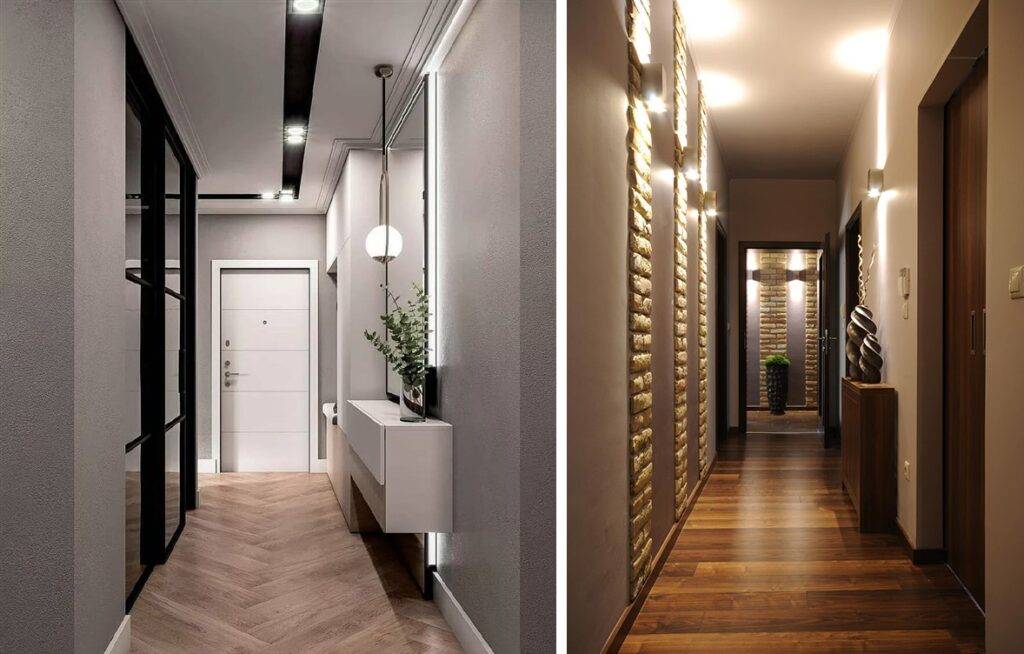 Использование двух зон в таких коридорах является одной из основных характеристик. Этого можно добиться, применив к каждой зоне освещение в одном стиле или разное.