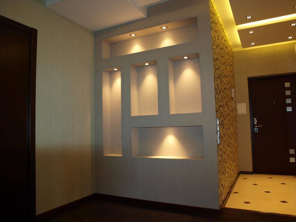 Устройство ниши с подсветкой. Так можно создать световые перепады в помещении, что позволяет значительно улучшить его подсветку. В данном случае рекомендовано установить в нише точечные светильники. Они будут использоваться в качестве дополнительного освещения.