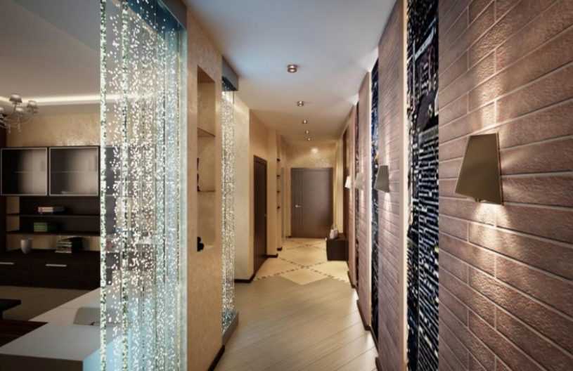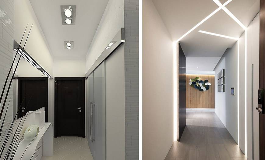 Для этого они разделят освещение длинного коридора на несколько зон. У каждой из них будет своя концепция дизайна. В основной зоне будут установлены приборы с высокой яркостью, освещающие в основном стены или зеркало, так как они могут отражать любые потоки. Если это не помогает, то можно использовать скрытое потолочное освещение с точечными или направленными источниками света (светодиодные ленты).