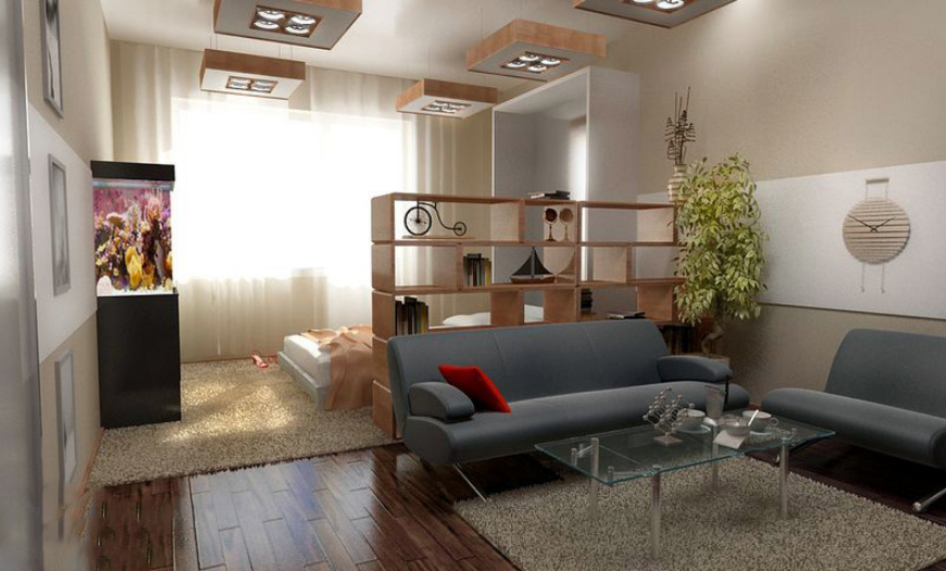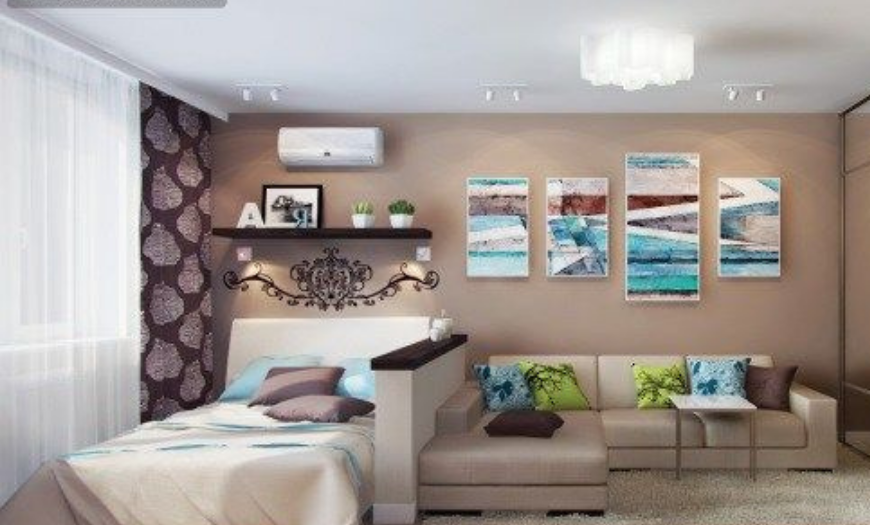 Чтобы одно помещение в квартире выполняло сразу несколько функций, его следует разделить на зоны. Используйте оттенки цвета, перегородки, портьеры, мебель.