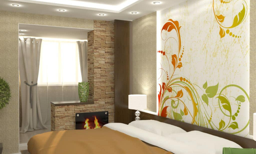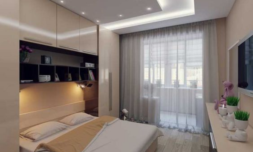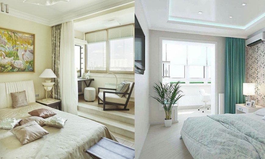 При наличии балкона в спальне рекомендуется его утеплить и объединить с основным помещением. Дополнительную площадь можно приспособить под зимний сад, рабочий кабинет или гардеробную. Для зонирования пространства используйте подоконную тумбу: поставьте на нее горшочные растения и ночник.