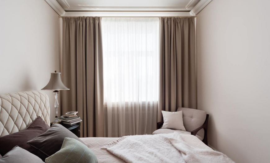 Плотные шторы из дорогого текстиля станут отличным обрамлением для окон в больших спальнях или с большим количеством естественного освещения. Для небольшого пространства стоит подобрать лёгкие светлые ткани.