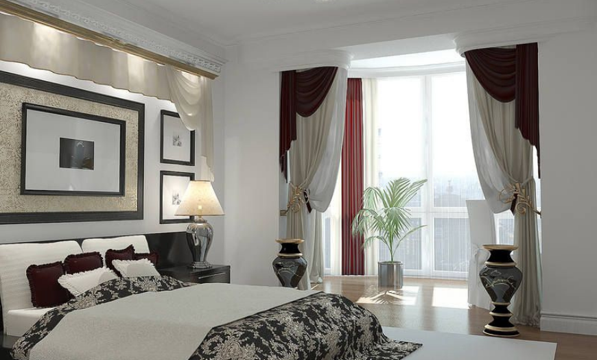 Текстура драпировок на окнах, покрывал зависит от габаритов комнаты.