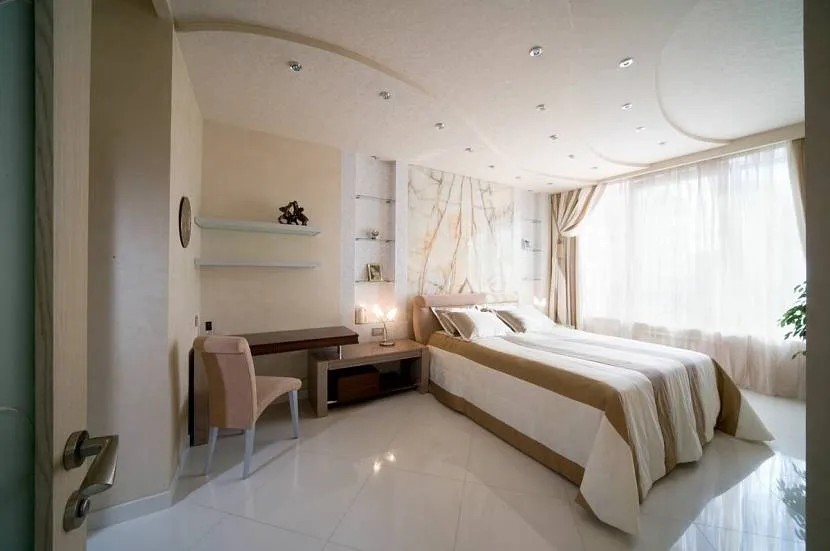 Для спальной лучше смотрится потолочное покрытие нейтральных, пастельных оттенков. Это же касается формы и структуры потолка. Не стоит монтировать что-то кричащее и вычурное. Спальня предназначена прежде всего для отдыха.